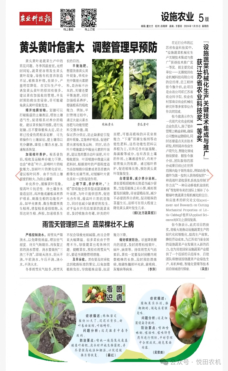 在近日公(gong)布(bu)的江(jiang)蘇省農(nong)(nong)(nong)業(ye)(ye)科技(ji)獎中,“設施蔬菜機(ji)械(xie)化生產關鍵(jian)技(ji)術集成(cheng)與推廣”獲得技(ji)術推廣獎一等獎。據(ju)主要(yao)完成(cheng)單位——無錫悅田農(nong)(nong)(nong)業(ye)(ye)機(ji)械(xie)科技(ji)有限公(gong)司的總經理、總工程(cheng)師張(zhang)今旗介紹,此項(xiang)目(mu)是由該公(gong)司和江(jiang)蘇省農(nong)(nong)(nong)業(ye)(ye)科學院(yuan)、農(nong)(nong)(nong)業(ye)(ye)農(nong)(nong)(nong)村部(bu)南京農(nong)(nong)(nong)業(ye)(ye)機(ji)械(xie)化研究所等多家單位合作共同完成(cheng)。